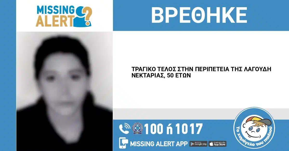 Σύμφωνα με ανακοίνωση που εξέδωσε Το Χαμόγελο του Παιδιού, η περιπέτεια της Λαγούδη Νεκταρίας, 50 ετών, έληξε με τραγικό τρόπο, βυθίζοντας στη θλίψη τους δικούς της ανθρώπους που την αναζητούσαν.