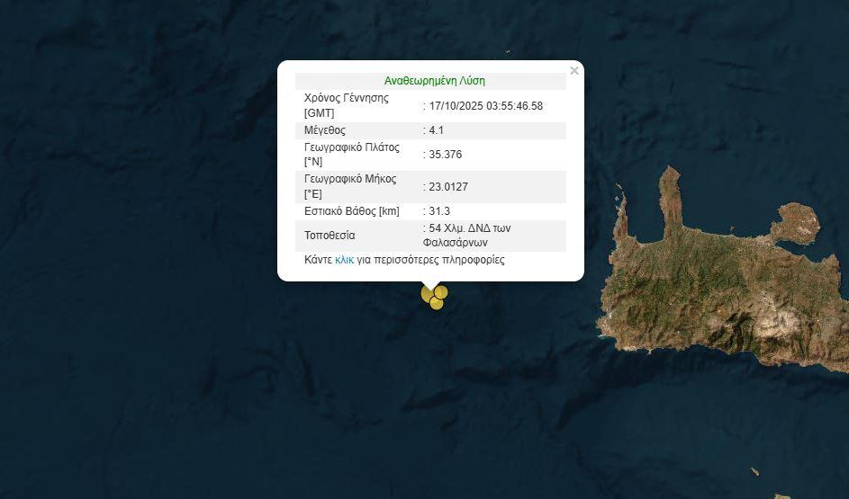 Σεισμός 4,1 Ρίχτερ σημειώθηκε νωρίς το πρωί της Παρασκευής (17/10) στις 06:55.