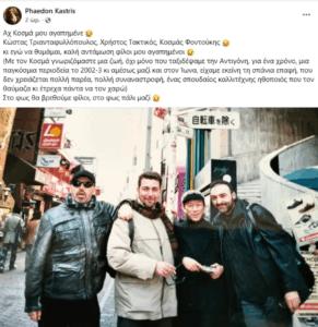 «Έφυγε ο Κοσμάς Φουντούκης. Στο καλό, μοναδικό πλάσμα» σημείωσε χαρακτηριστικά ο Κώστας Μπερικόπουλος στη λεζάντα της ανάρτησης στον προσωπικό του λογαριασμό στο Facebook την οποία και συνόδευσε με μια φωτογραφία του συναδέλφου του.