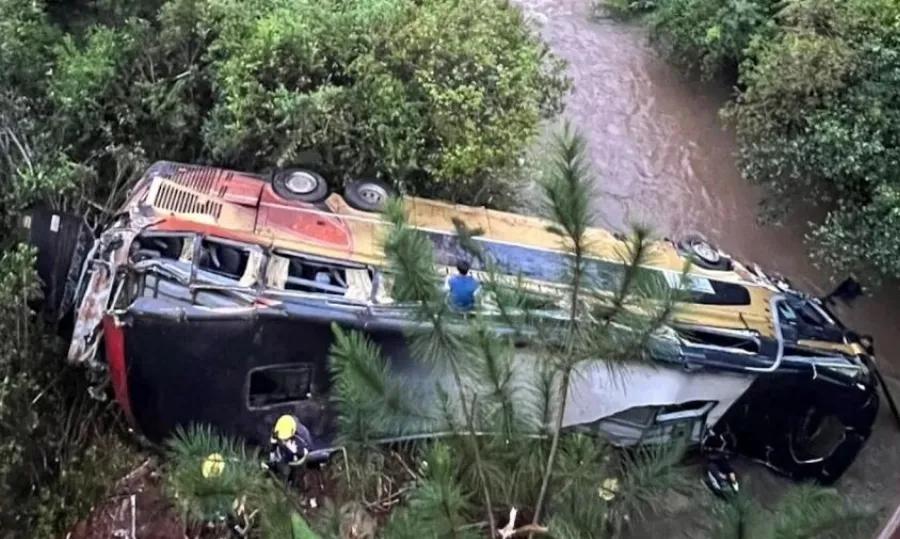 Ως αποτέλεσμα της σύγκρουσης, το λεωφορείο πήρε κλίση και έπεσε από τη γέφυρα στην κοίτη ενός ποταμού, σε βάθος αρκετών μέτρων.