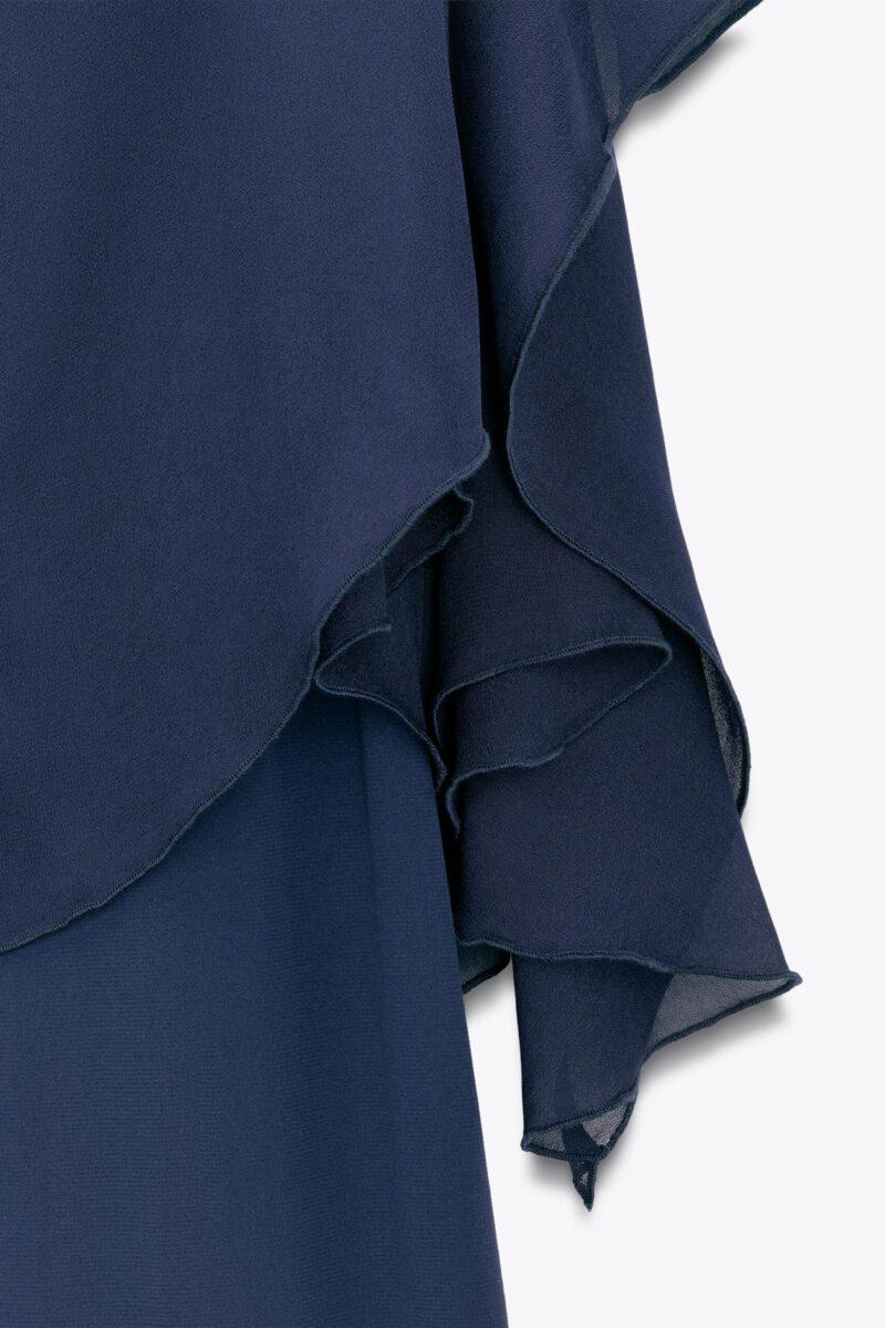 Το ασύμμετρο ύφασμα τύπου κάπα και οι πιέτες στο στήθος χαρίζουν διακριτική κίνηση και χαρίζουν επιπλέον στιλ, ενώ το V ντεκολτέ αναδεικνύει τη γραμμή του λαιμού και των ώμων με κομψό τρόπο. Η λεπτομέρεια στο ύφασμα και η ροή του φορέματος επιτρέπουν στην κάθε γυναίκα να νιώθει άνετα, ενώ ταυτόχρονα εντυπωσιάζει με το στιλ της.