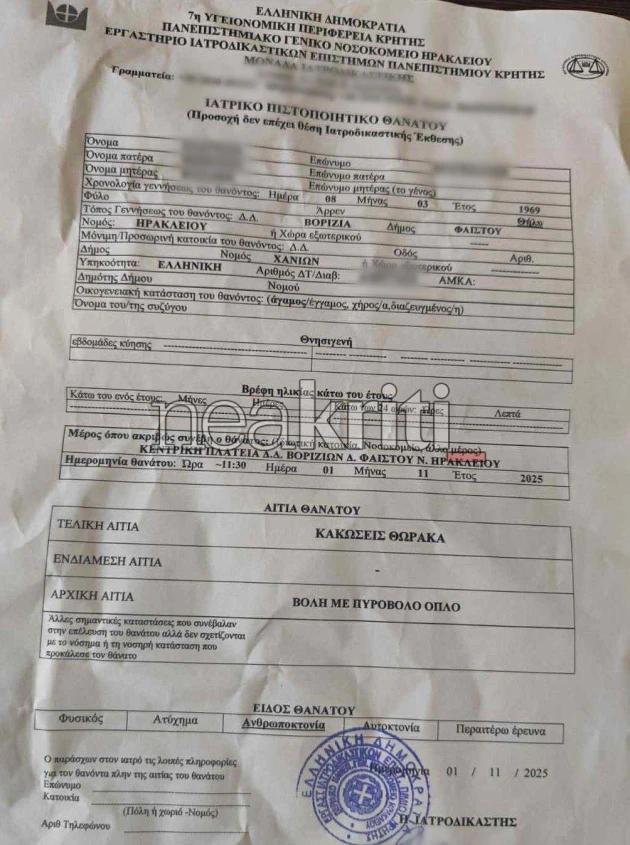 Στο πιστοποιητικό θανάτου της αναφέρεται ως αιτία θανάτου «βολή από πυροβόλο όπλο».