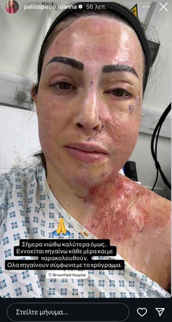 Η Ιωάννα Παλιοσπύρου λοιπόν, στις τελευταίες της αναρτήσεις έδειξε τις ουλές της και το αποτέλεσμα των θεραπειών με λέιζερ, ενώ είναι φανερό ότι το δέρμα της είναι αρκετά ερεθισμένο. Μάλιστα, όπως παραδέχτηκε, ήταν μια επίπονη διαδικασία, με την ίδια να γράφει: «Εχθές εξαφανίστηκα γιατί… βλέπετε. Πήρα πολλά παυσίπονα και δέχτηκα πολλή ενέργεια laser… Σήμερα νιώθω καλύτερα όμως… Εννοείται πηγαίνω κάθε μέρα και με παρακολουθούν. Όλα πηγαίνουν σύμφωνα με το πρόγραμμα».