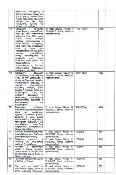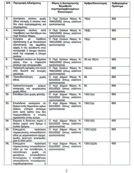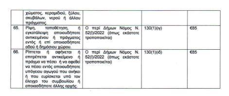 Σύμφωνα με το νομοσχέδιο που κατέθεσε στη Βουλή η Νομική Υπηρεσία, προνοείται η επιβολή εξώδικου προστίμου των 85 ευρώ για συνολικά 22 αδικήματα, μεταξύ των οποίων για τίναγμα χαλιών στο δρόμο, έκχυση νερού ή άλλου υγρού από δρόμο ή αυλάκι, πρόκληση οχληρίας από συνεχές γαύγισμα ή ακόμα και παρακώλυση οδού από αυτοκίνητο, φορτηγό, άμαξα ή ακόμη και άλογο.