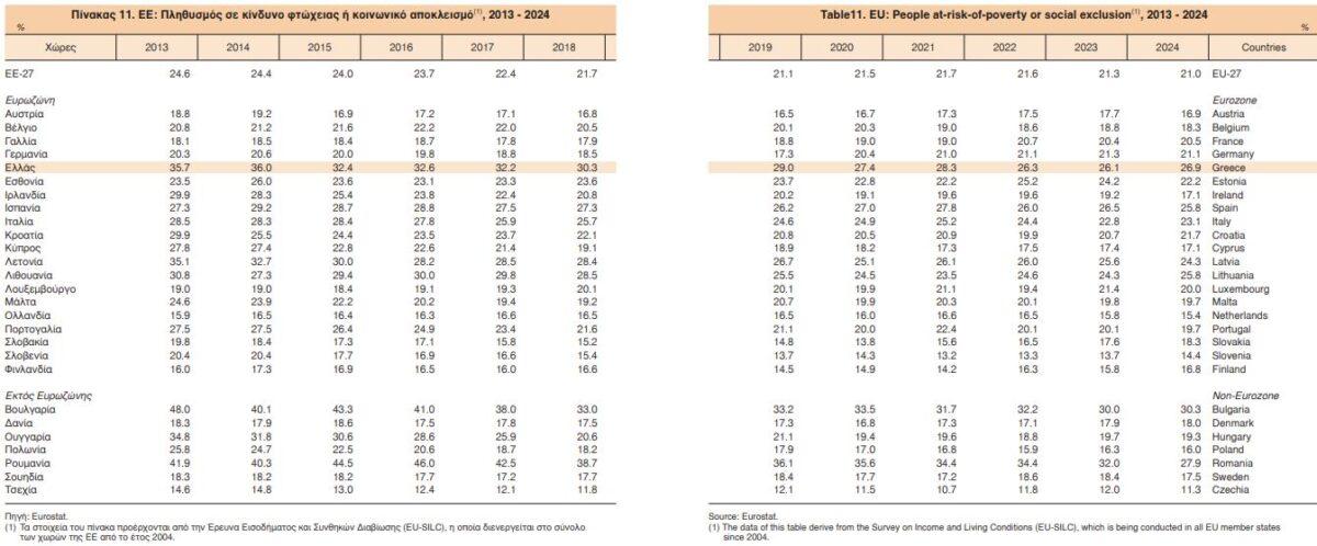 Σύμφωνα με τα στοιχεία της Eurostat για το 2024, το ποσοστό των Ελλήνων πολιτών σε κίνδυνο φτώχειας και κοινωνικού αποκλεισμού ήταν 26,9%, όταν ο μέσος όρος της Ευρώπης των 27 ήταν 21%. Χειρότερα ποσοστά κατέγραψαν μόνο η Ρουμανία (27,9%) και η Βουλγαρία (30,3%). Η δεύτερη εντάσσεται στη ζώνη του ευρώ την 1η Ιανουαρίου του 2026.