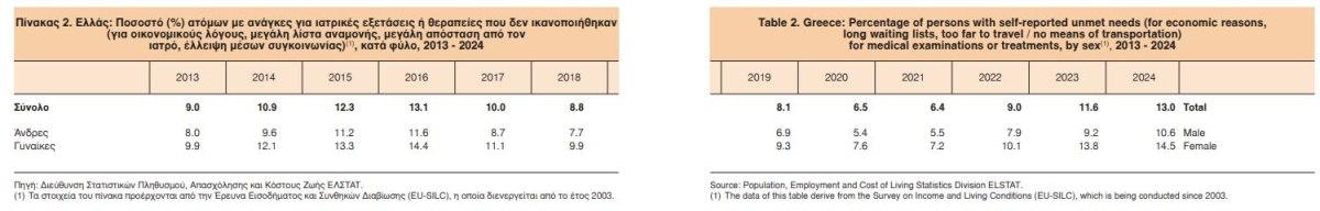 Σύμφωνα με την έρευνα της ΕΛΣΤΑΤ, το 13% των Ελλήνων δήλωσε το 2023 ότι δεν κατάφερε να λάβει την απαραίτητη ιατρική εξέταση ή θεραπεία. Δηλαδή οι άνθρωποι αυτοί ανέβαλαν ιατρικά ραντεβού, δεν υποβλήθηκαν σε επεμβάσεις ή παραιτήθηκαν από θεραπείες. Οι λόγοι περιλαμβάνουν οικονομικές δυσκολίες, λίστες αναμονής, δυσκολία μετακίνησης από την επαρχία προς το κέντρο.