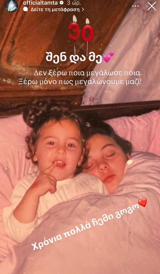 Η μονάκριβη κόρη της Τάμτα, Άννα γιόρτασε τα 30α γενέθλιά της. Η ταλαντούχα ερμηνεύτρια έγινε μαμά σε ηλικία 14 ετών και ουσιαστικά μεγάλωσε μαζί με την κόρη της. Με αφορμή τα γενέθλια της Άννας της, η Τάμτα μοιράστηκε μία φωτογραφία από εκείνα τα χρόνια στη Γεωργία η οποία είναι συγκλονιστική. Στο στιγμιότυπο, η τραγουδίστρια, μικρό έφηβο κορίτσι, κοιμάται αγκαλιά με την κόρη της που ήταν τότε μωρό.