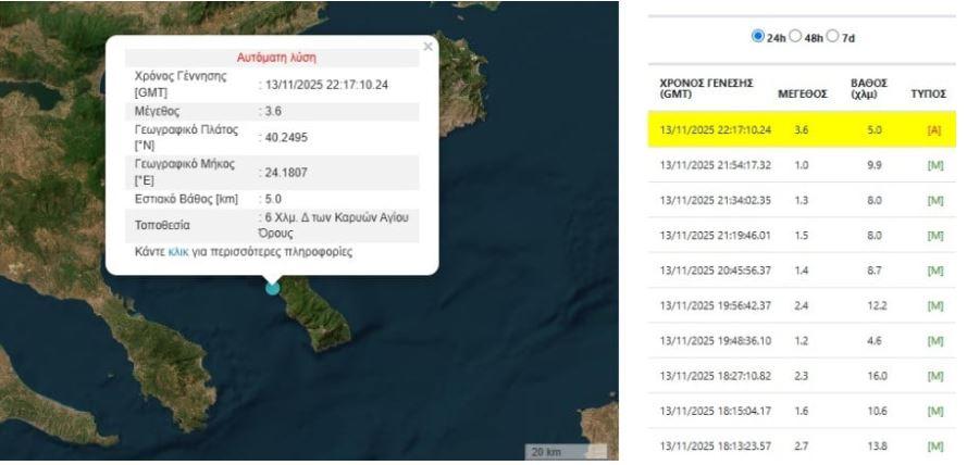 Λίγο μετά τα μεσάνυχτα της Πέμπτης, η ησυχία του Αγίου Όρους διαταράχθηκε από μια σεισμική δόνηση που υπενθύμισε την έντονη γεωλογική δραστηριότητα της περιοχής. Σύμφωνα με τα στοιχεία του Γεωδυναμικού Ινστιτούτου του Εθνικού Αστεροσκοπείου Αθηνών, ο σεισμός είχε μέγεθος 3,6 βαθμών της κλίμακας Ρίχτερ.