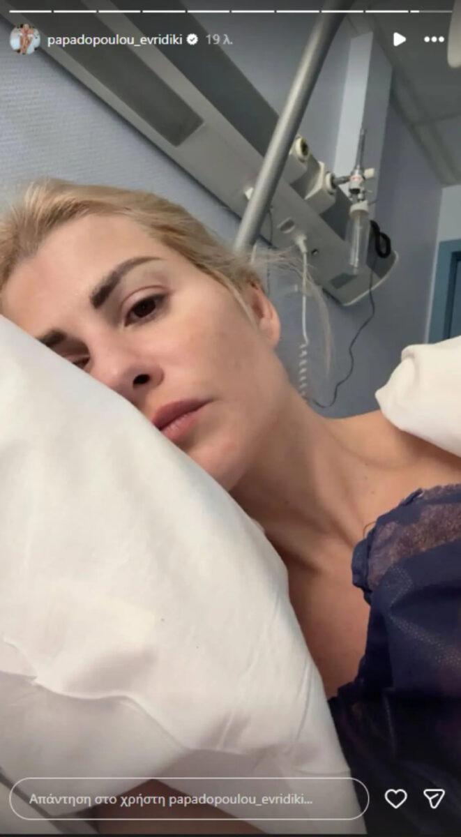 Συγκεκριμένα, στη φωτογραφία φαίνεται η ίδια να είναι ξαπλωμένη στο κρεβάτι του νοσοκομείου, ενώ δείχνει αρκετά ταλαιπωρημένη. Η Ευρυδίκη Παπαδοπούλου ποζάρει ανέκφραστη στην κάμερα, χωρίς ωστόσο να αποκαλύπτει περισσότερες λεπτομέρειες για τα αίτια της νοσηλείας της.