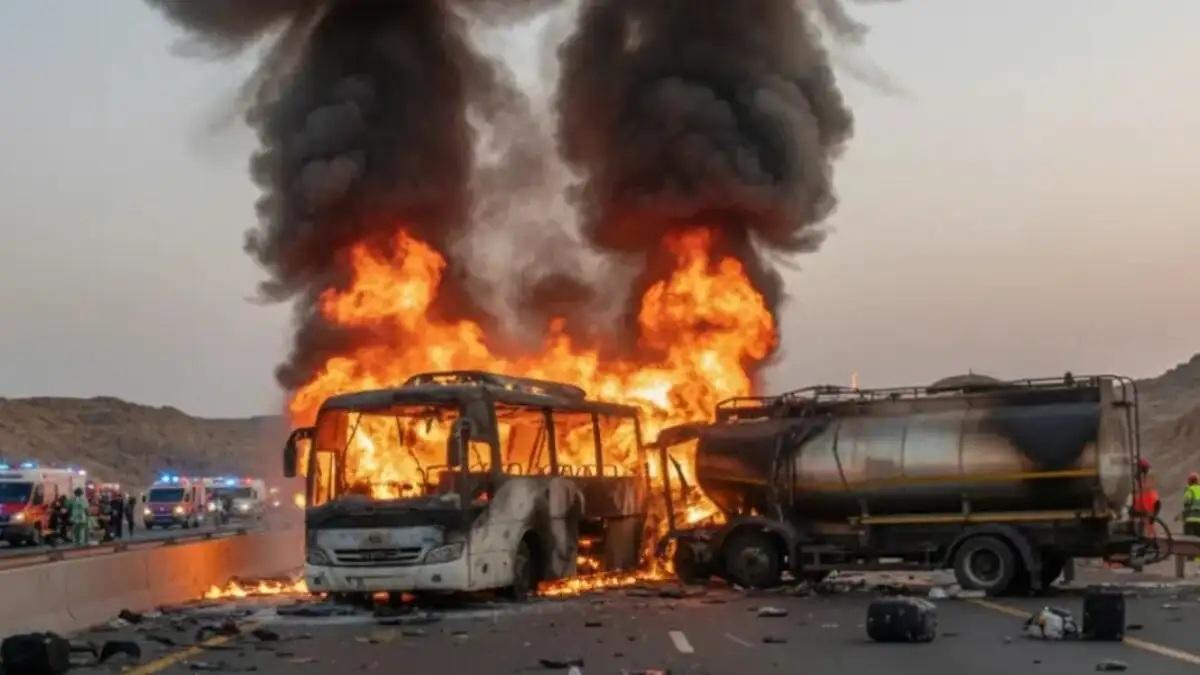A horrific accident in Saudi Arabia has taken the lives of 42 Umrah pilgrims, many of them women and children from Hyderabad. Their bus collided with a diesel tanker, and within moments, flames engulfed everything.