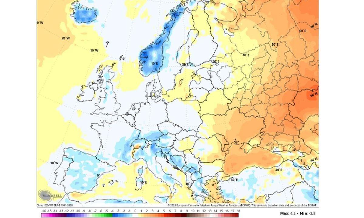 Η Ευρώπη, συνολικά, μετατοπίζεται σε θερμότερη τάση, με αυξημένες πιθανότητες για πιο ήπιο καιρό στα νότια.
