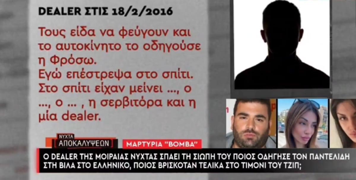 Λίγο αργότερα, οι τρεις αποφάσισαν να αναχωρήσουν από τη λέσχη. Ο Χριστόφορος πρότεινε στην Φρόσω να οδηγήσει, καθώς ο Παντελίδης δεν ήταν σε θέση να πάρει το τιμόνι. Τη στιγμή που κατευθύνονταν στο αυτοκίνητο, ο τραγουδιστής σκοντάφτει πάνω σε χαλίκια και πέφτει, με αποτέλεσμα να χρειαστεί βοήθεια για να καθίσει στη θέση του συνοδηγού. Η Φρόσω ανέλαβε την οδήγηση, ενώ η Μίνα κάθισε στο πίσω κάθισμα. Ο dealer βεβαιώνει ότι τους είδε να απομακρύνονται από τον χώρο με την Φρόσω στη θέση του οδηγού. «Τους είδα να φεύγουν και το αυτοκίνητο το οδηγούσε η Φρόσω. Εγώ επέστρεψα στο σπίτι. Στο σπίτι είχαν μείνει ο…, ο…, η σερβιτόρα και η μία dealer», ανέφερε χαρακτηριστικά.