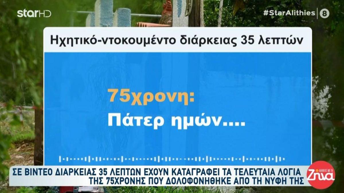 Σοκ προκαλούν τα στοιχεία που βλέπουν το φως της δημοσιότητας για τη βίαιη δολοφονία της 75χρονης στη Σαλαμίνα από τη 46χρονη νύφη της που έχει οδηγηθεί στα δικαστήρια. Η εκπομπή «Αλήθειες με τη Ζήνα» παρουσίασε τον διάλογο ανάμεσα στις δύο γυναίκες λίγο πριν η ηλικιωμένη χάσει τη ζωή της από τα χέρια της νύφης της.