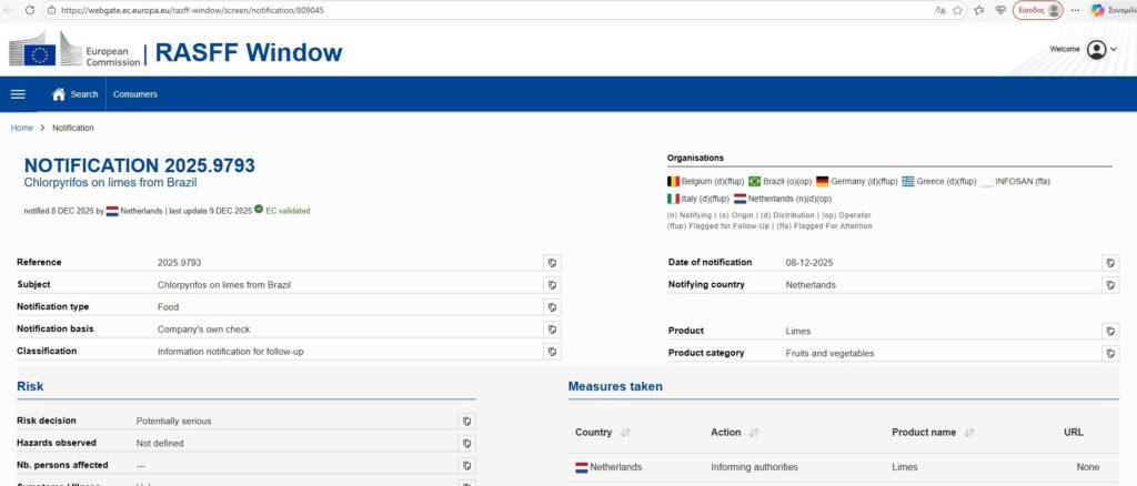 Η Ολλανδία εξέδωσε στις 8 Δεκεμβρίου προειδοποίηση για την παρουσία χλωρπυρίφου, ενός επικίνδυνου φυτοφαρμάκου, σε λεμόνια εισαγόμενα από τη Βραζιλία. Η ανάλυση έδειξε ότι τα υπολείμματα ξεπερνούν τα επιτρεπόμενα όρια (0,032 mg/kg αντί για 0,01 mg/kg), γεγονός που καθιστά το προϊόν πιθανώς σοβαρό κίνδυνο για την υγεία των καταναλωτών. Πρόκειται για ένα νευροτοξικό φυτοφάρμακο με τη δραστική ουσία χλωροπυριφός (chlorpyrifos), το οποίο ενοχοποιείται κυρίως για την γέννηση λιποβαρών νεογνών, προβλήματα διάσπασης προσοχής και μειωμένου IQ στα παιδιά.
