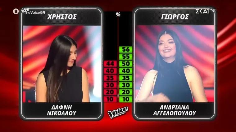 Η Ανδριάννα Αγγελοπούλου από την ομάδα του Γιώργου Μαζωνάκη ήταν εκείνη που πήρε την πρόκριση στο αποψινό live cross battle του The Voice, επικρατώντας απέναντι στη Δάφνη Νικολάου από την ομάδα του Χρήστου Μάστορα.