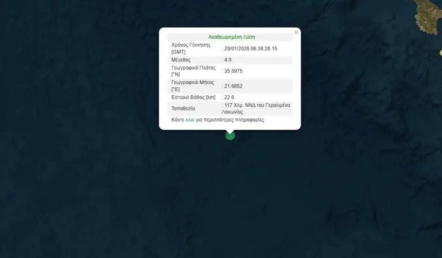 Σεισμός μεγέθους 4 βαθμών της κλίμακας Ρίχτερ σημειώθηκε το πρωί της Τρίτης, 20 Ιανουαρίου, στη Λακωνία.