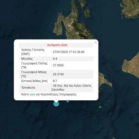 Σεισμική δόνηση 4,4 Ρίχτερ σημειώθηκε ανοιχτά της Ζακύνθου, το απόγευμα της Τρίτης (27/1).