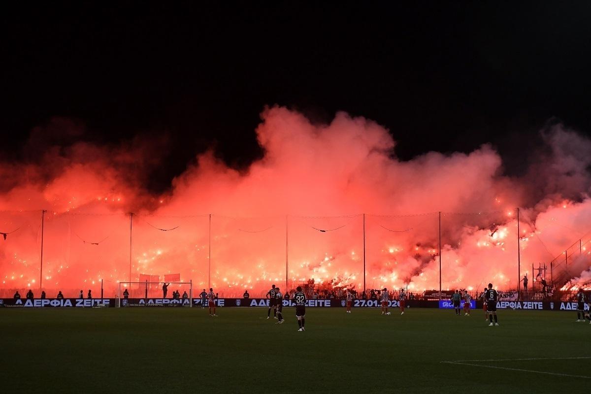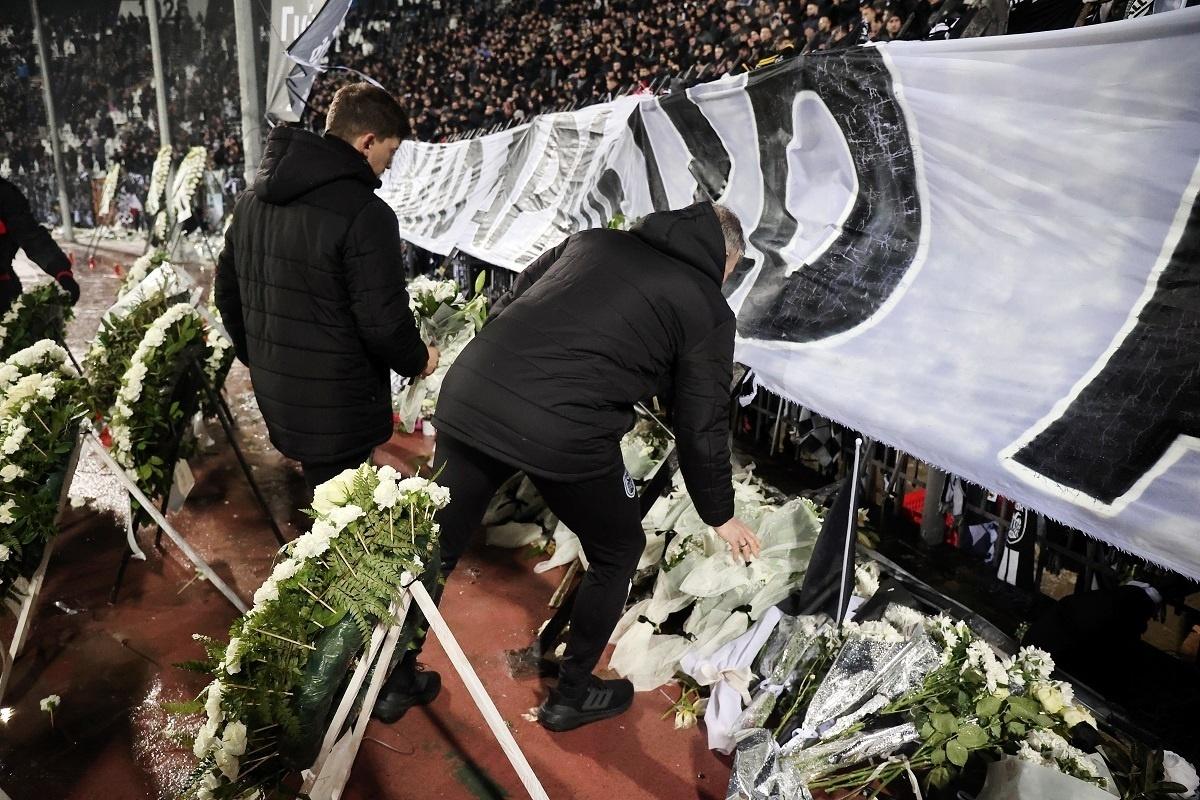 Πριν την έναρξη του αγώνα, αντιπροσωπεία των δύο ομάδων αλλά και φιλάθλων κατέθεσαν στεφάνια μπροστά από τη Θύρα 4 για τους επτά φιλάθλους του ΠΑΟΚ που έχασαν τη ζωή τους στη Ρουμανία. Εκεί έχει αναρτηθεί γιγαντοπανό που γράφει “Καλό παράδεισο αδέρφια 27/1/2026” ενώ αρκετοί κρατούν πλακάτ με τις φωτογραφίες των θυμάτων.
