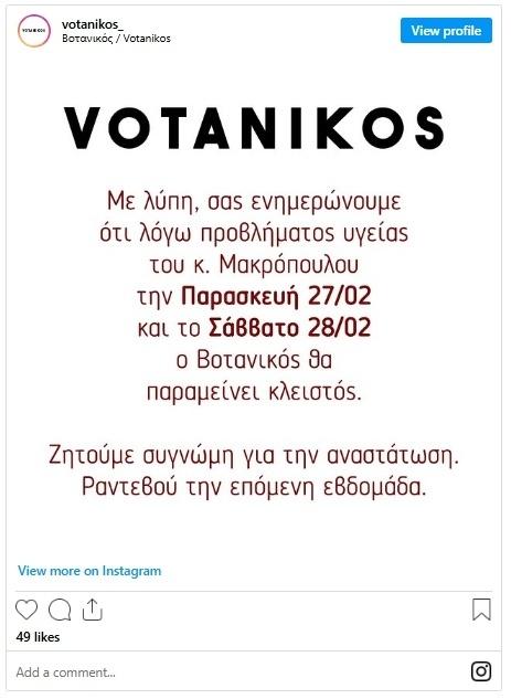 «Με λύπη, σας ενημερώνουμε ότι λόγω προβλήματος υγείας του κ. Μακρόπουλου την Παρασκευή 27/02 και το Σάββατο 28/02, ο Βοτανικός θα παραμείνει κλειστός» αναφέρεται στο post του νυχτερινού καταστήματος στο Instagram.