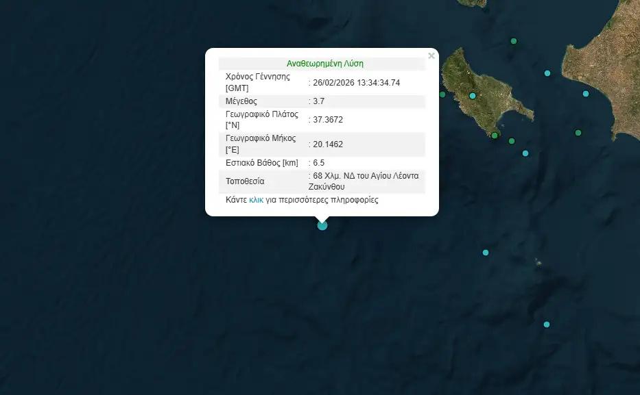 Σεισμός μεγέθους 3,7 βαθμών της κλίμακας Ρίχτερ σημειώθηκε ανοιχτά από τη Ζάκυνθο την Πέμπτη (26.02.2026) σύμφωνα με το Γεωδυναμικό Ινστιτούτο του Εθνικού Αστεροσκοπείου Αθηνών.