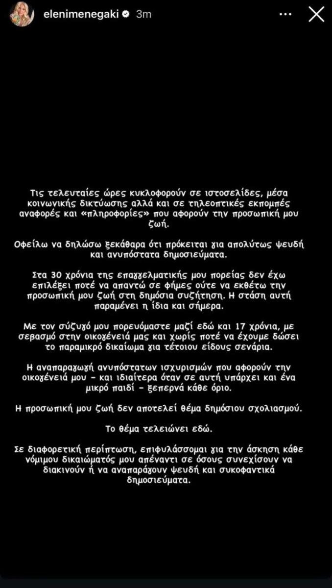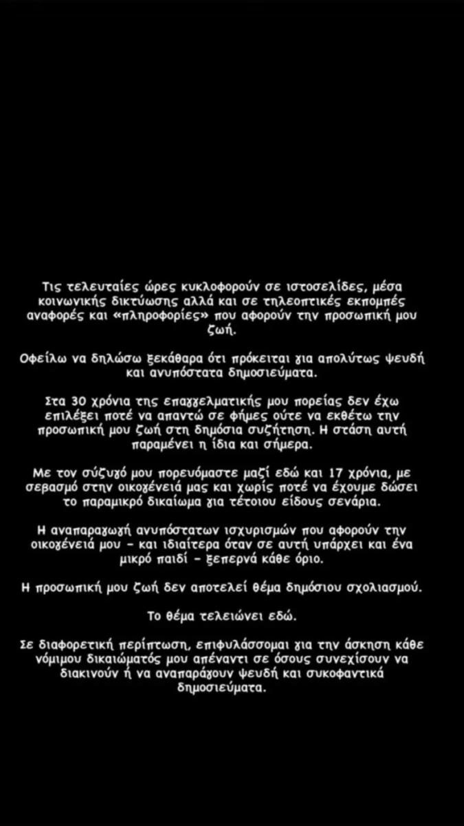 «Τις τελευταίες ώρες κυκλοφορούν σε ιστοσελίδες, μέσα κοινωνικής δικτύωσης αλλά και σε τηλεοπτικές εκπομπές αναφορές και «πληροφορίες» που αφορούν την προσωπική μου ζωή.
