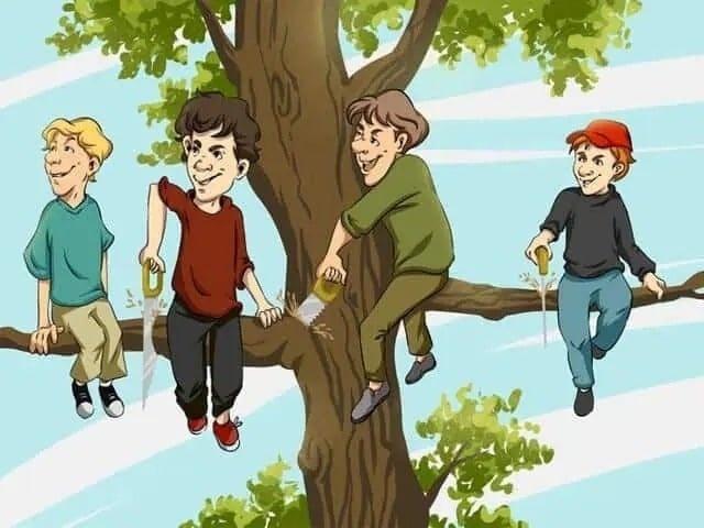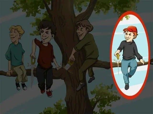 Αν μαντέψατε ότι το παιδί με το κόκκινο καπέλο (νούμερο 4) κάνει το μεγαλύτερο λάθος, συγχαρητήρια! Είναι εκείνο που πριονίζει το κλαδί πάνω στο οποίο κάθεται — και είναι σίγουρο ότι θα πέσει.