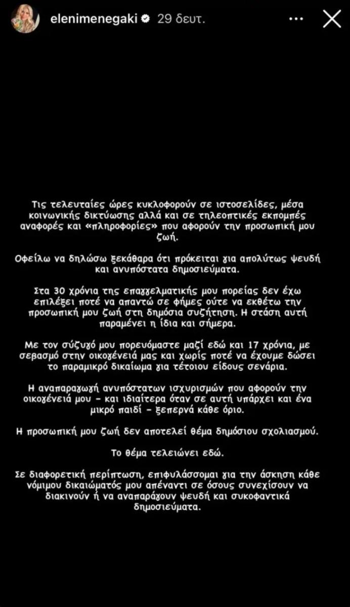 Σε διαφορετική περίπτωση, επιφυλάσσομαι για την άσκηση κάθε νόμιμου δικαιώματός μου απέναντι σε όσους συνεχίσουν να διακινούν ή να αναπαράγουν ψευδή και συκοφαντικά δημοσιεύματα» έγραψε η Ελένη Μενεγάκη στο Instagram.
