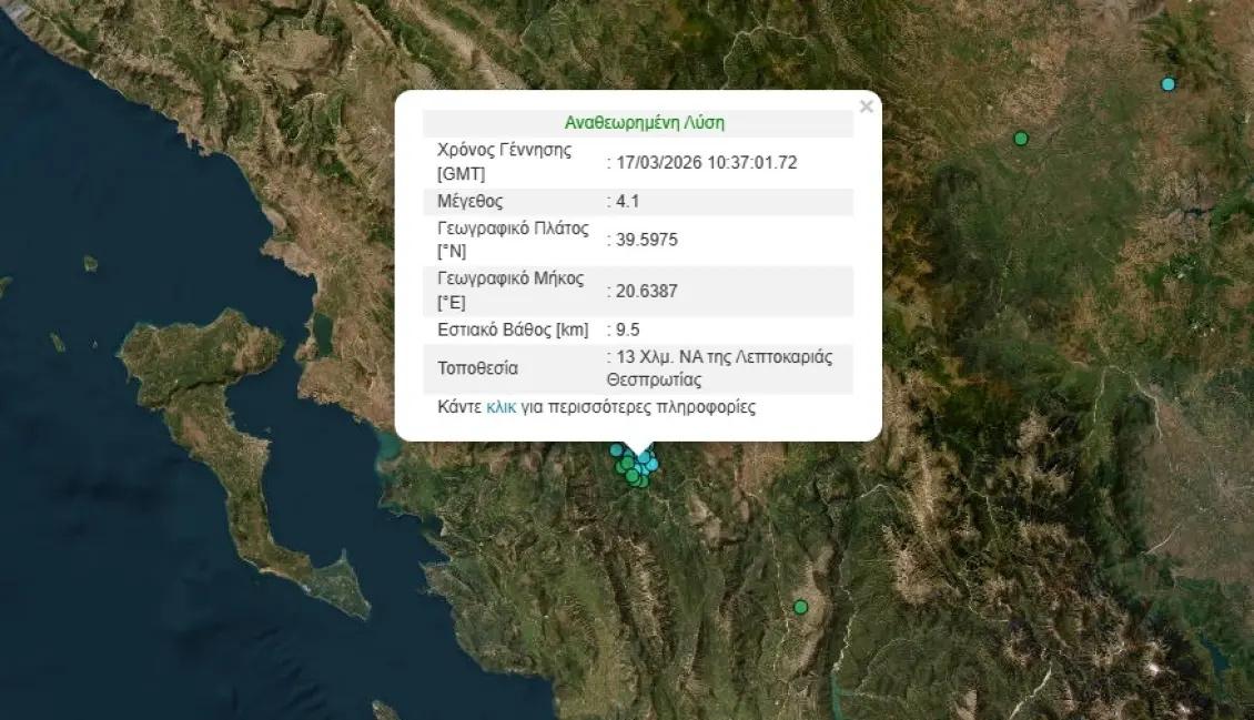 Το επίκεντρο της δόνησης εντοπίζεται 13 χιλιόμετρα Νοτιοανατολικά της Λεπτοκαρυάς Θεσπρωτίας, σε μία ορεινή περιοχή κοντά στα όρια των νομών Θεσπρωτίας και Ιωαννίνων.