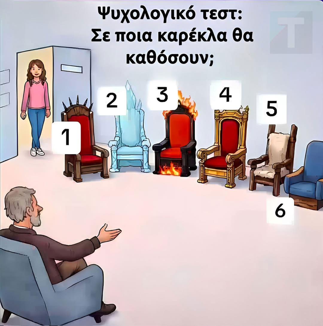 Μερικές φορές, οι πιο απλές επιλογές μπορούν να αποκαλύψουν πράγματα που δεν φανταζόμαστε. Ένα φαινομενικά απλό «ψυχολογικό τεστ» με καρέκλες μπορεί να δείξει τι σε εκφράζει περισσότερο αυτή τη στιγμή — τη δύναμη, την ανάγκη για ηρεμία, τον έλεγχο ή το πάθος.