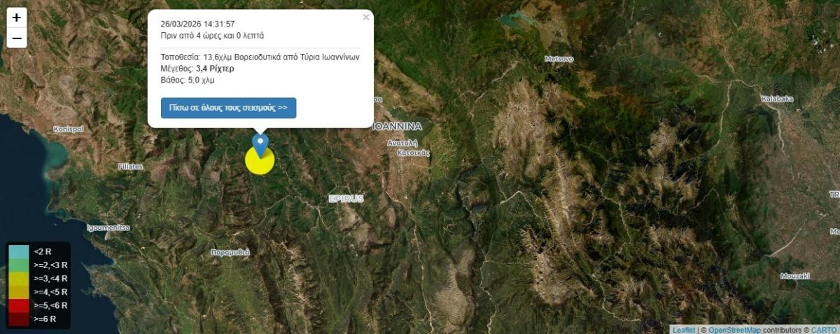 Σύμφωνα με πληροφορίες από seismos.gr, σεισμική δόνηση 3,4 βαθμών της κλίμακας Ρίχτερ συνέβη στις 26/03/2026 14:31:57, 13,6χλμ Βορειοδυτικά από Τύρια Ιωαννίνων και σε εστιακό βάθος 5,0 χιλιομέτρων.