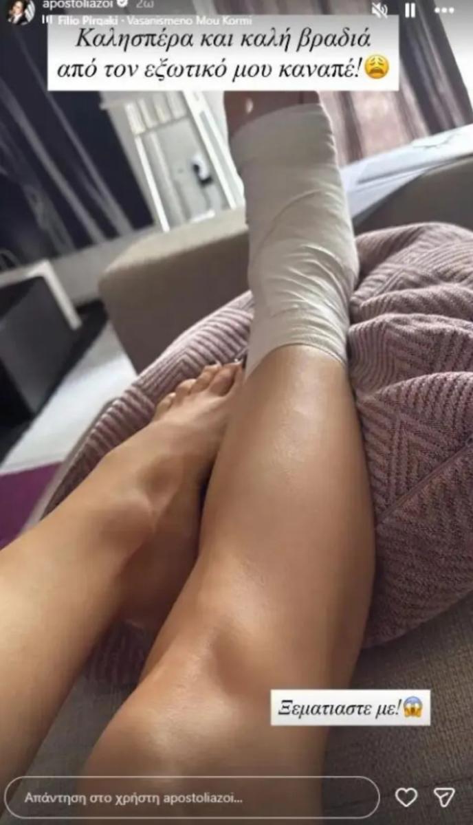 Πιο συγκεκριμένα, όπως έκανε γνωστό η Αποστολία Ζώη το απόγευμα της Παρασκευής 3 Απριλίου, βρέθηκε στο νοσοκομείο, μετά από ατύχημα όταν έπεσε από τη σκάλα, με αποτέλεσμα να πάθει διάστρεμμα στο πόδι της.