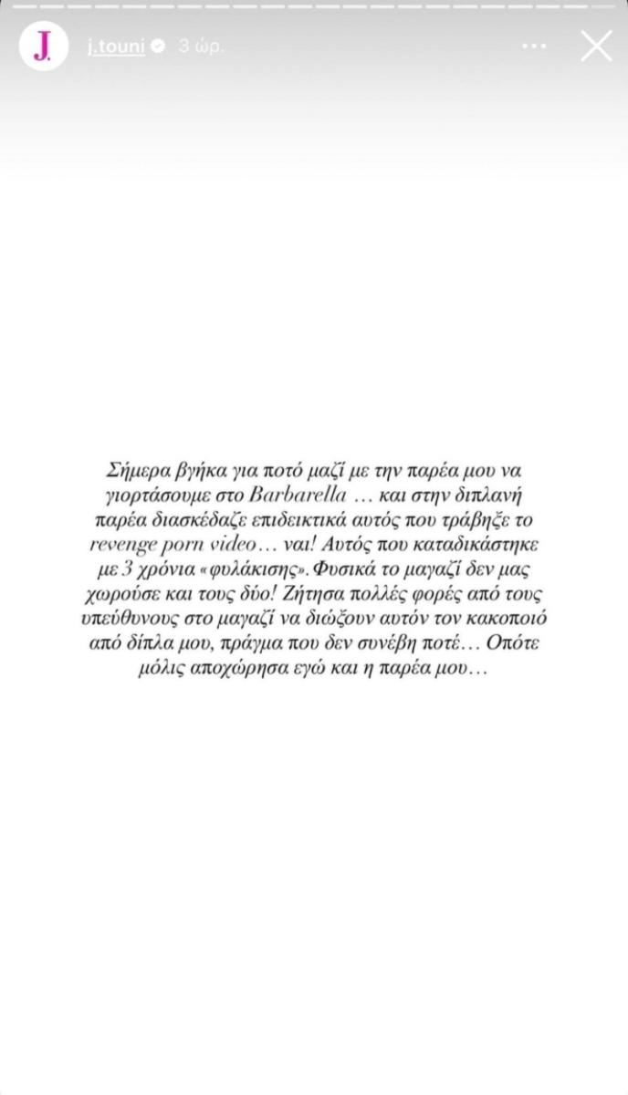 “Σήμερα βγήκα για ποτό μαζί με την παρέα μου να γιορτάσουμε…και στη διπλανή παρέα διασκέδαζε επιδεικτικά αυτός που τράβηξε το revenge porn video…ναι! Αυτός που καταδικάστηκε με τρία χρόνια “φυλάκισης”. Φυσικά το μαγαζί δε μας χωρούσε και τους δυο! Ζήτησα πολλές φορές από τους υπεύθυνους να διώξουν αυτόν τον κακοποιό από δίπλα μου, πράγμα που δε συνέβη ποτέ! Οπότε, μόλις αποχώρησα εγώ και η παρέα μου”, έγραψε η επιχειρηματίας – influencer που βγήκε με τους φίλους της να γιορτάσει το τέλος του μαρτυρίου της, έπειτα από 9 χρόνια.