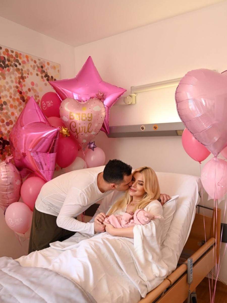 Στις εικόνες που δημοσίευσε, το δωμάτιο στο μαιευτήριο είναι γεμάτο ροζ μπαλόνια και διακοσμητικά, δημιουργώντας ένα σκηνικό γιορτής για τον ερχομό της μικρής Πολυξένης-Αλεξάνδρας. Δίπλα της βρίσκεται και ο σύντροφός της, Παναγιώτης Κουτσουμπής, με τον οποίο μοιράζεται αυτές τις πρώτες, μοναδικές στιγμές ως μαμά και μπαμπάς πλέον.