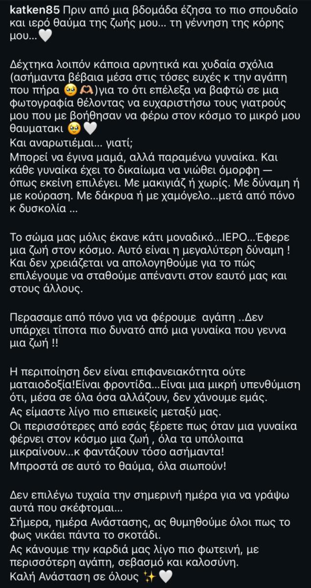 «Πριν από μια βδομάδα έζησα το πιο σπουδαίο και ιερό θαύμα της ζωής μου… τη γέννηση της κόρης μου…Δέχτηκα λοιπόν κάποια αρνητικά και χυδαία σχόλια (ασήμαντα βέβαια μέσα στις τόσες ευχές κ την αγάπη που πήρα για το ότι επέλεξα να βαφτώ σε μια φωτογραφία θέλοντας να ευχαριστήσω τους γιατρούς μου που με βοήθησαν να φέρω στον κόσμο το μικρό μου θαυματακι
